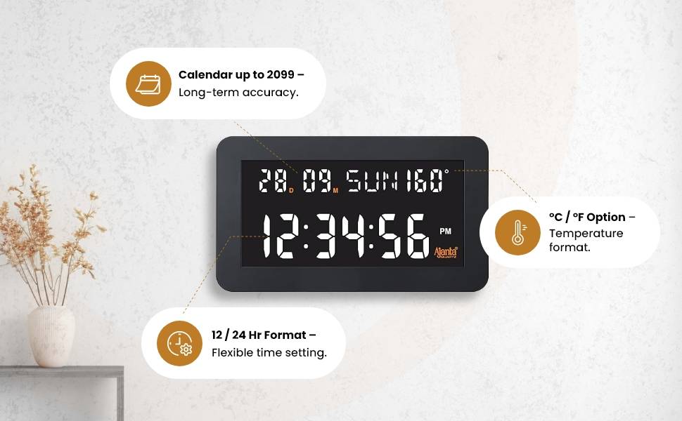 A clock with a firm matte look and a solid stunning finish, making it very demanding and attention-seeking. It has standard dimensions, due to which it has no issues meeting the buyer’s desires. A lustrous frame adds to its glamour and an indicated non-numeral system makes it unique. Its wands also hold a considerable luster which is hardly seen in many clocks. It features a simple yet elegant white interface that balances with the lustrous make of its key components. This clock is usually preferred in official as well as domestic or public localities, pertaining to its universally superficial make In case of power Failure no need to reset the time ( Battery Backup Provided ) AM & PM LED Indication Seven Segment Display for Date, Month , day, Hour , Minute , Second & Temperature User Selectable C / F Temperature Format Calendar up to year 2099 Sixteen segment Display for Days ( Sun,Mon,Tues,Wed,Thu,Fri & Saturday ) 12/24 Hrs. Time Format Function 5v DC 1 AMP USB ” C” Type Charger