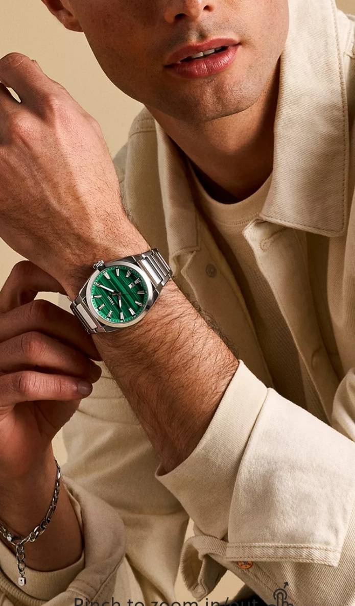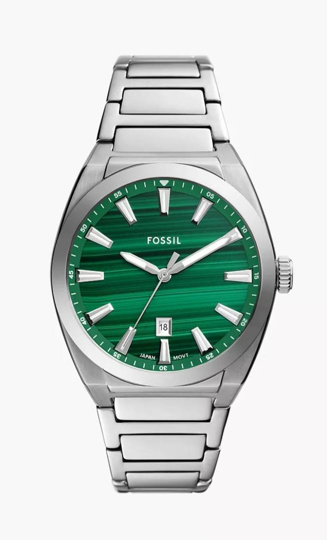 Everett Three-Hand Date Stainless Steel Watch fs6056 Featuring colours that are on trend for the season, this sporty Everett watch favors the bold with a stainless steel H-link bracelet and genuine malachite stone dial featuring eye-catching indices. Sku: FS6056 Case Size: 42 mm Movement: Quartz Three-Hand Date Platform: EVERETT Strap Material: Stainless Steel Strap Colour: Silver Case Water Resistance: 5 ATM Case Material: Stainless Steel Generic Name: Traditional Watches Case Colour: Silver Dial Colour: Green Strap Fashion Colour: Silver-Tone Strap Width: 18 mm Closure: Single Press Deployant Buckle Strap Inner Circumference: 200 +/- 5 mm Crystal Type: Mineral Battery Type: SR626SW Mrp.21995