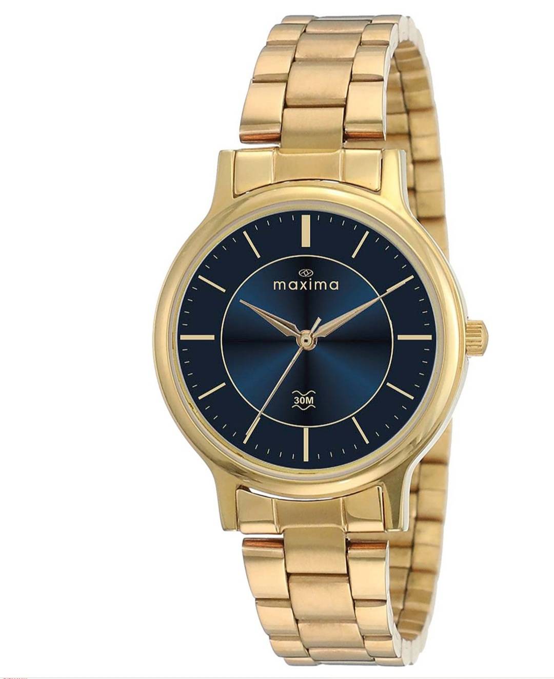 Brand: Maxima For: Women Display: Analog Dial Color: Blue Strap Color: Gold Strap Material: Metal (Stainless Steel Look) Movement: Quartz Water Resistance: 30M (Daily use – hand wash, light splash safe) Glass: Mineral Glass Occasion: Casual, Office, Party, Gift Warranty: 1 Year Manufacturer Warranty