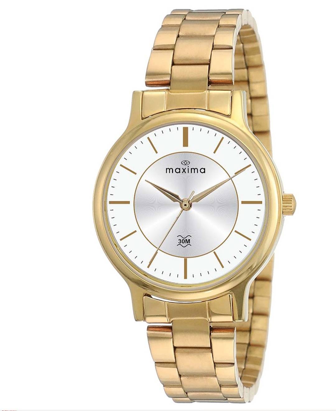 Brand: Maxima For: Women Display: Analog Dial Color: Blue Strap Color: Gold Strap Material: Metal (Stainless Steel Look) Movement: Quartz Water Resistance: 30M (Daily use – hand wash, light splash safe) Glass: Mineral Glass Occasion: Casual, Office, Party, Gift Warranty: 1 Year Manufacturer Warranty