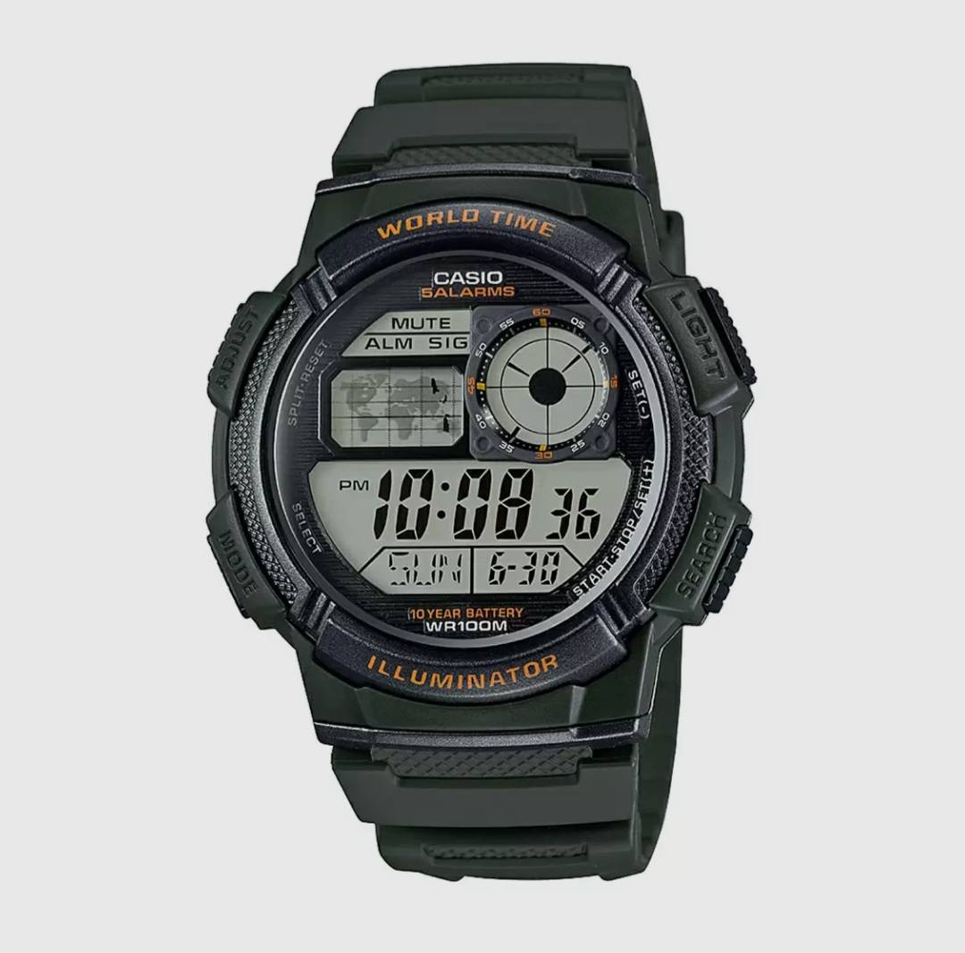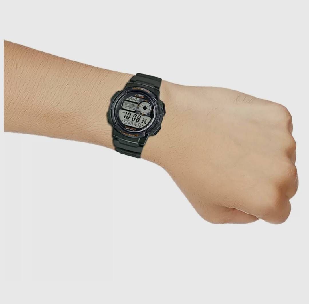 YOUTH AE-1000W-3AVDF - D119Green Digital - Unisex Watch Mrp 3,595 Inclusive of all taxes 10-YEAR BATTERY LIFE & WORLD TIME 100-meter water resistance World map for world time 1/100-second stopwatch LED light LC Analog display 2 years warranty Trusted Japanese Quality